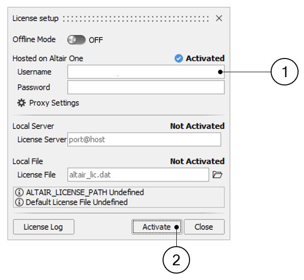 Figure 4 – License via Altair One - Dialog box - Enter the Username and Password you created for your Altair OneTM account (Mark 1 - Figure 4 – License via Altair One - Dialog box).