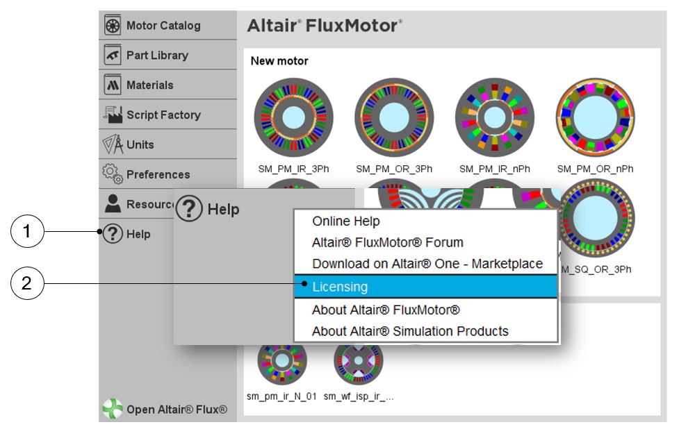 From the FluxMotor Supervisor, one can access to the license manager by clicking on the “Help” icon and then on the sub-menu Licensing that displays the “License setup” window.