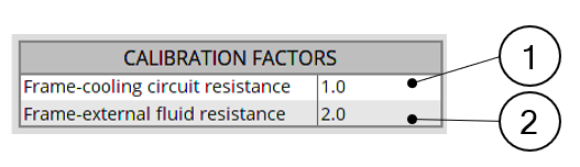 | 1 | Frame-cooling circuit resistance. This calibration factor is applied on the thermal resistance linking the frame and its cooling circuit. This X-factor exists only when a cooling circuit is defined by the user in the MACHINE subset, HOUSING panel, CIRCUIT setting. |