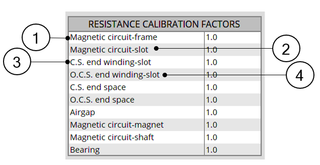 | 10 | Bearings. This calibration factor tunes the resistances existing across the Connection Side bearing and the Opposite Connection Side bearing. These resistances are the resistances computed directly from the bearing equivalent airgap thickness set by the user in INTERFACE settings. |