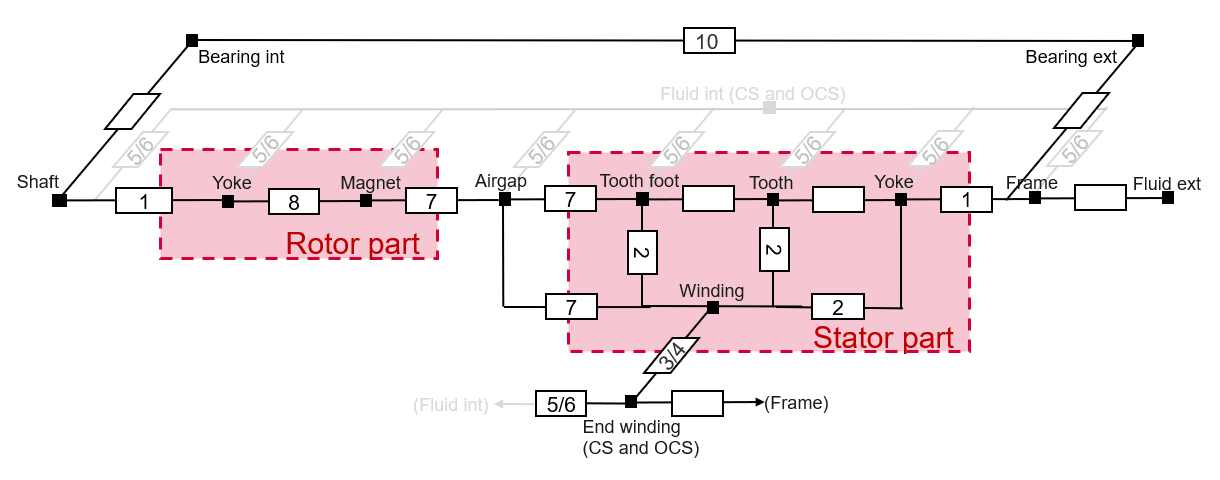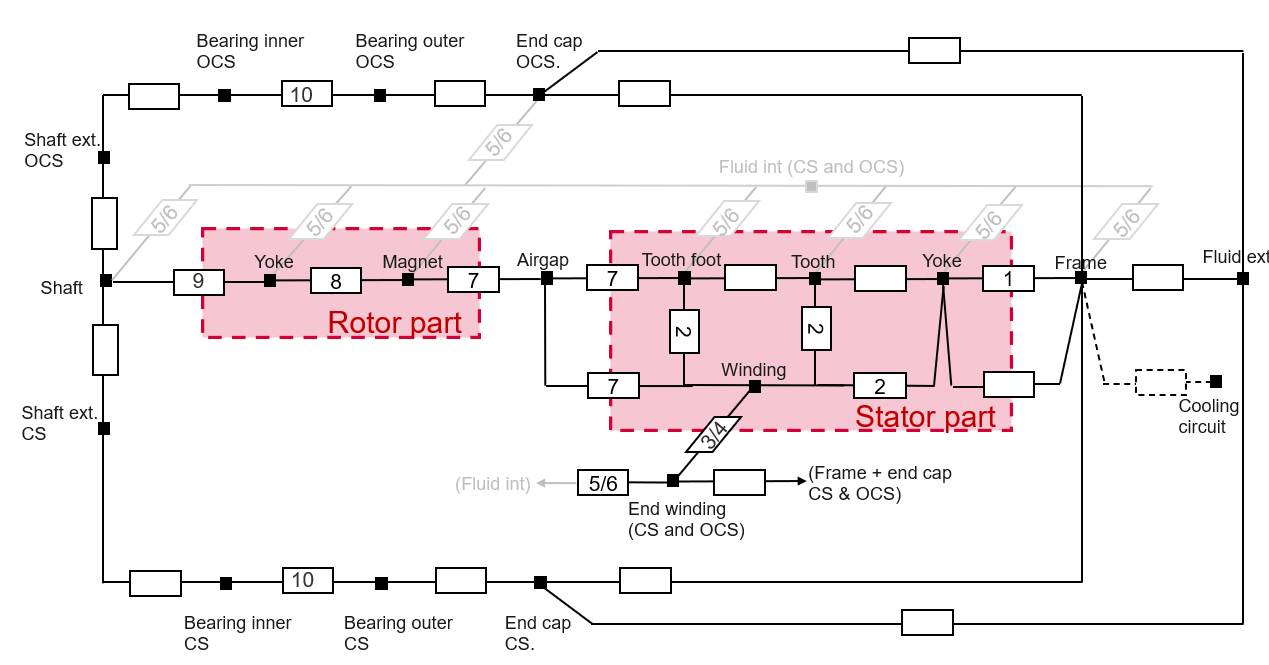 The following picture gives an example of a simple thermal circuit, including the main resistances corresponding to the default synchronous magnet machine, where a frame, a shaft and bearings have been added.