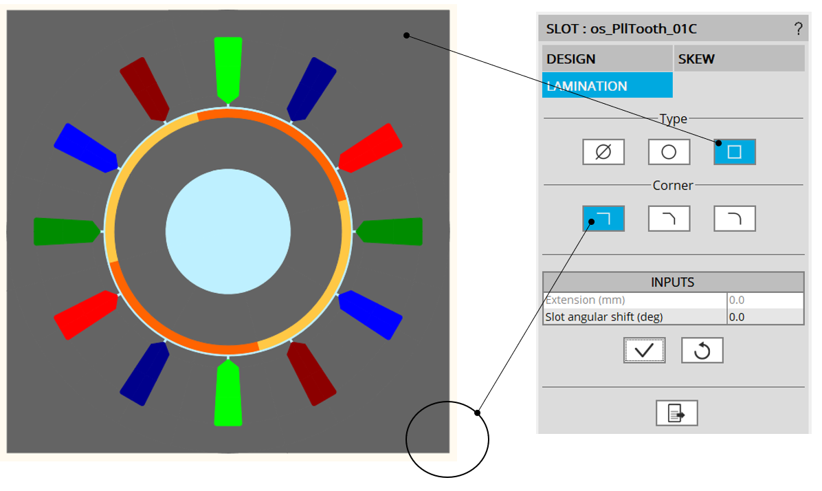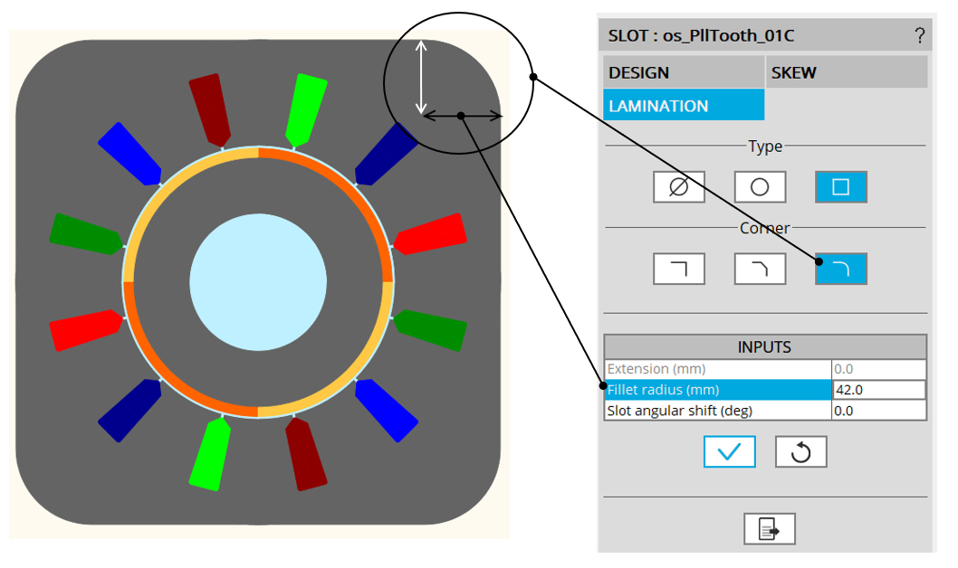 | Square shape lamination with fillet cornerSetting of the lamination fillet radius | Square shape lamination with right cornerSee the link with stator outer diameter |