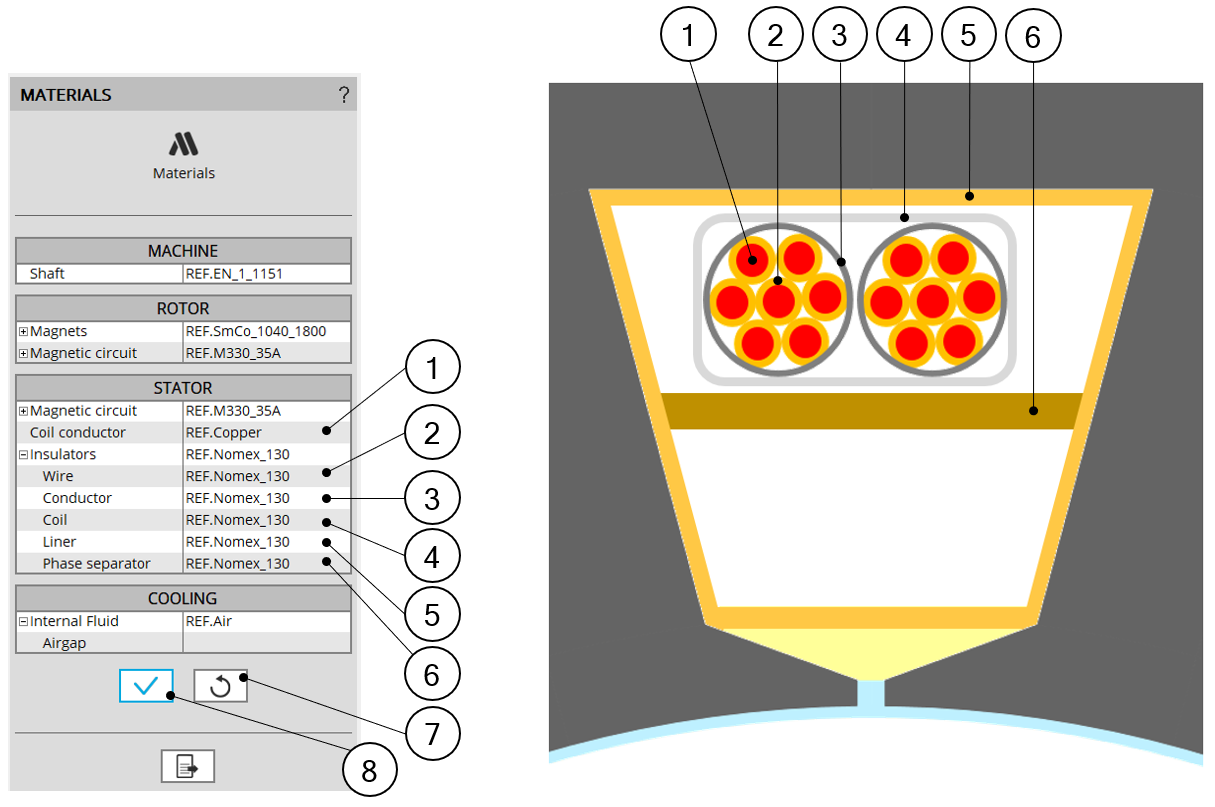| 8 | Button to validate assignment of materials. Pressing the enter key twice applies inputs too. |