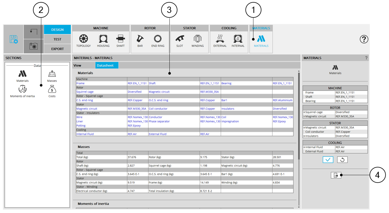 | 1 | Selection of the STATOR subset: MATERIALS panel (Click on the icon MATERIALS) |