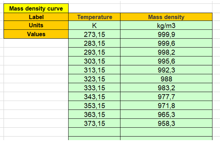 Here is the process to define the liquid thermal characteristics from the importation of series of points representing the considered quantity curve listed in an Excel file. In the following example water mass density is considered, however the same principle is applied for all other gas thermal quantity which are defined below.