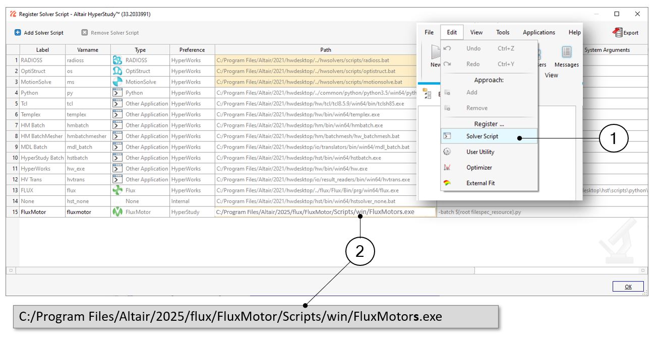 Before starting new studies in HyperStudy® by using connectors exported from FluxMotor®, FluxMotor® must be registered as a new solver script in HyperStudy®.
