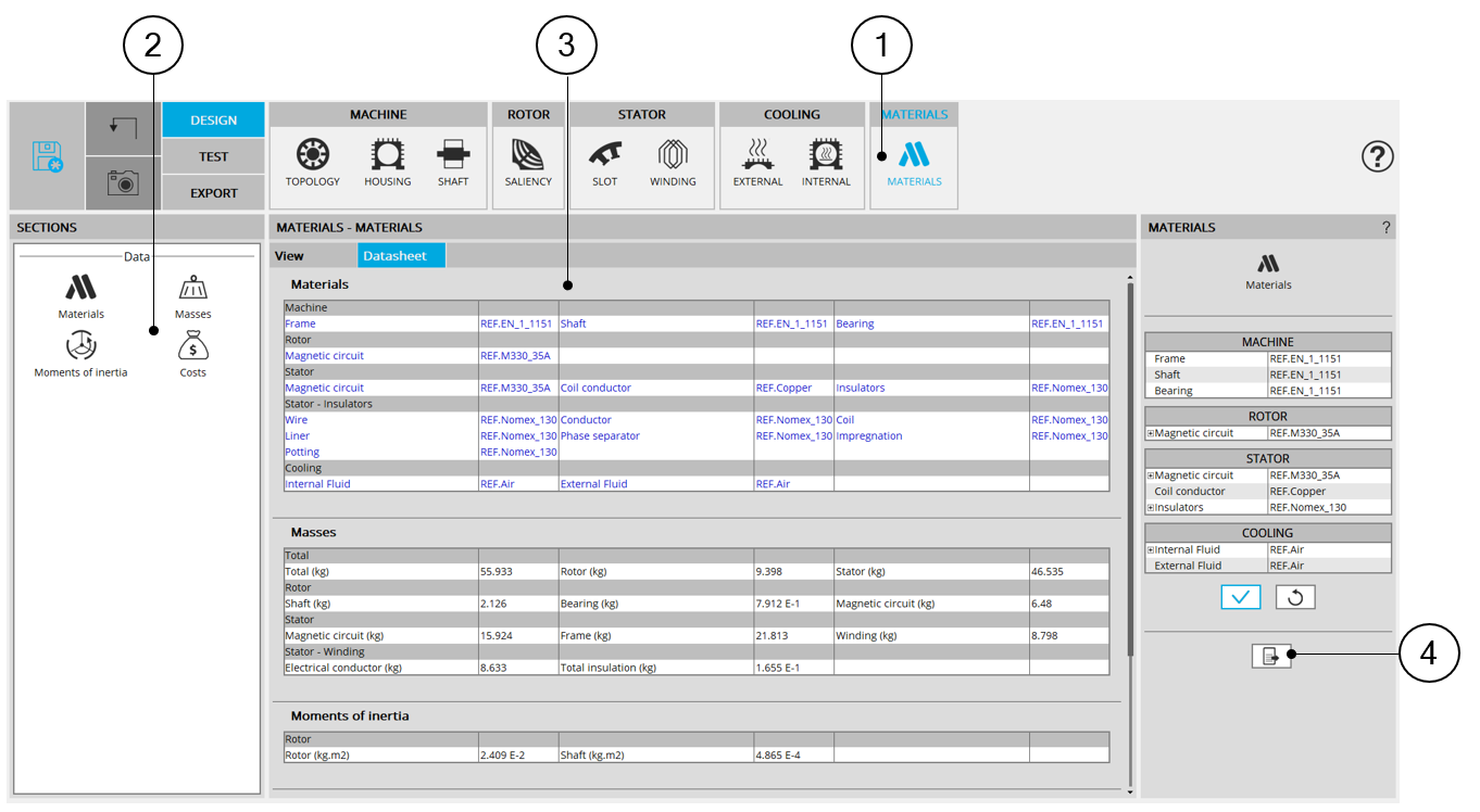 | 1 | Selection of the STATOR subset: MATERIALS panel (Click on the icon MATERIALS) |