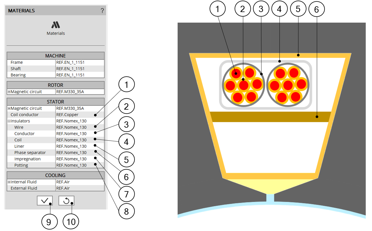 | 10 | Button to restore default materials. Default materials are those defined as favorite materials in Material database. See “Materials” application for more information. |