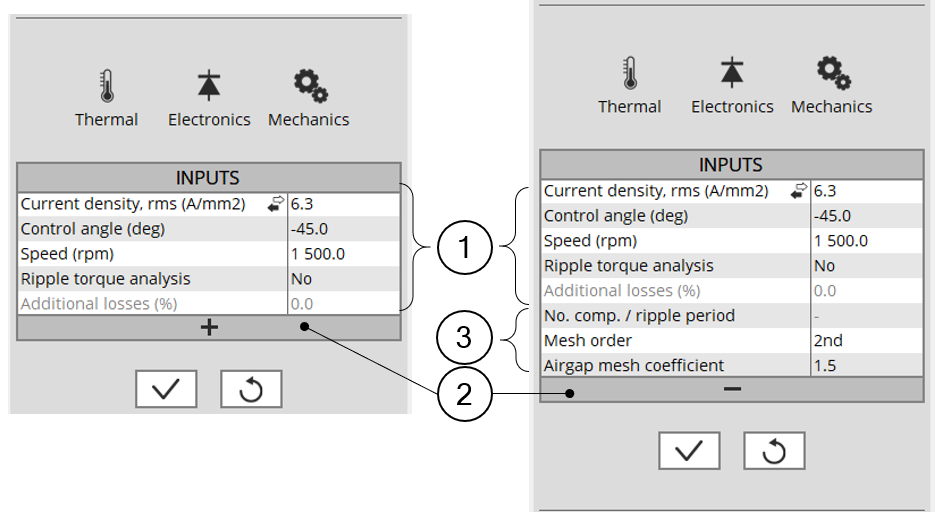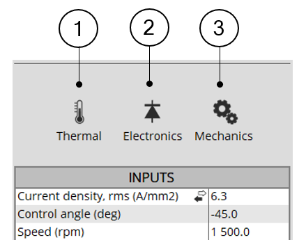 | 1 | Button to define the thermal inputs (Solving mode or winding temperatures) |