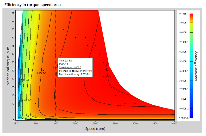 The second feature allows the user to define a duty cycle by giving a list of working points (speed, torque) versus the time. The displayed results illustrate the machine performance over the considered duty cycle (mean, min, and max values).