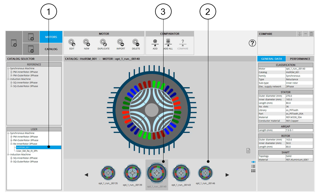 | 3 | Each motor can be selected, visualized and edited in the Motor Factory, to be evaluated more in depth |