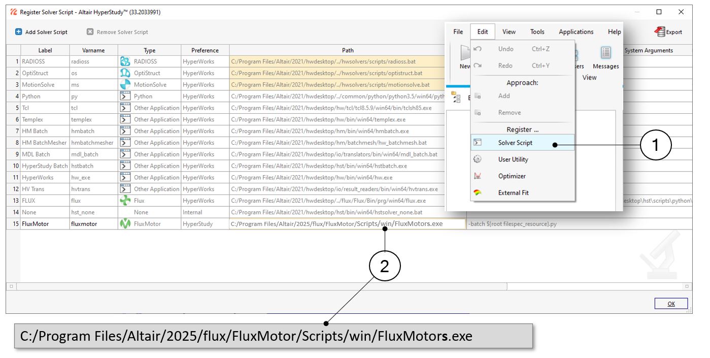 Before starting new studies in HyperStudy® by using connectors exported from FluxMotor® , FluxMotor® must be registered as a new solver script in HyperStudy®.