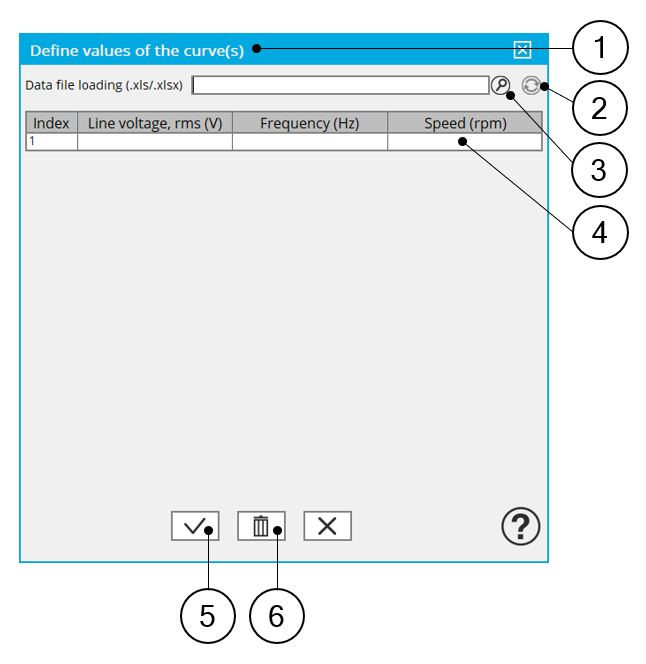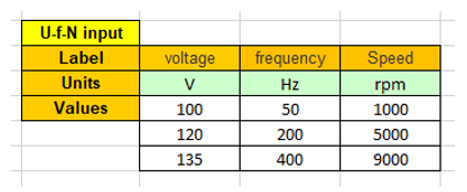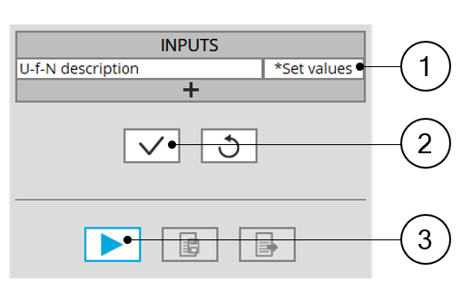 1 Click on the button “Set values” of the field “ U, f, N description” to define the working points in a dialog box. Refer to the next illustration which shows how to fill the working point table.