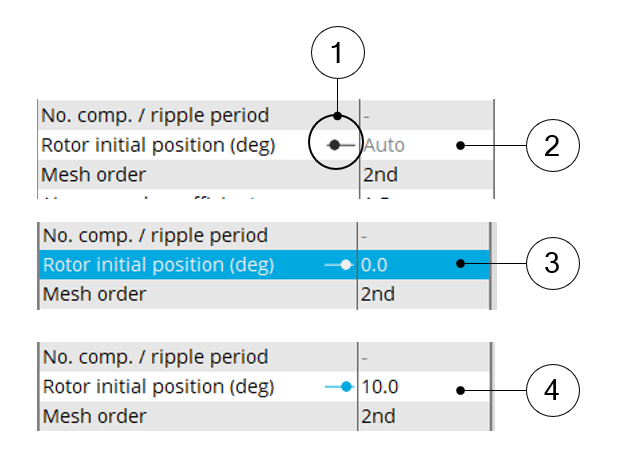 When the “Rotor initial position” is set to “User input” (i.e. toggle button on the right), the initial position of the rotor to be considered for computation must be set by the user in the field « Rotor initial position ».