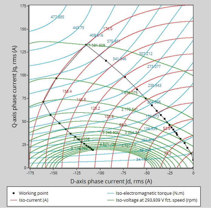 • Characteristic curves in Jd-Jq area - Evolution of the working points in Jd-Jq plane, with iso-torque, iso-current and iso-voltage.