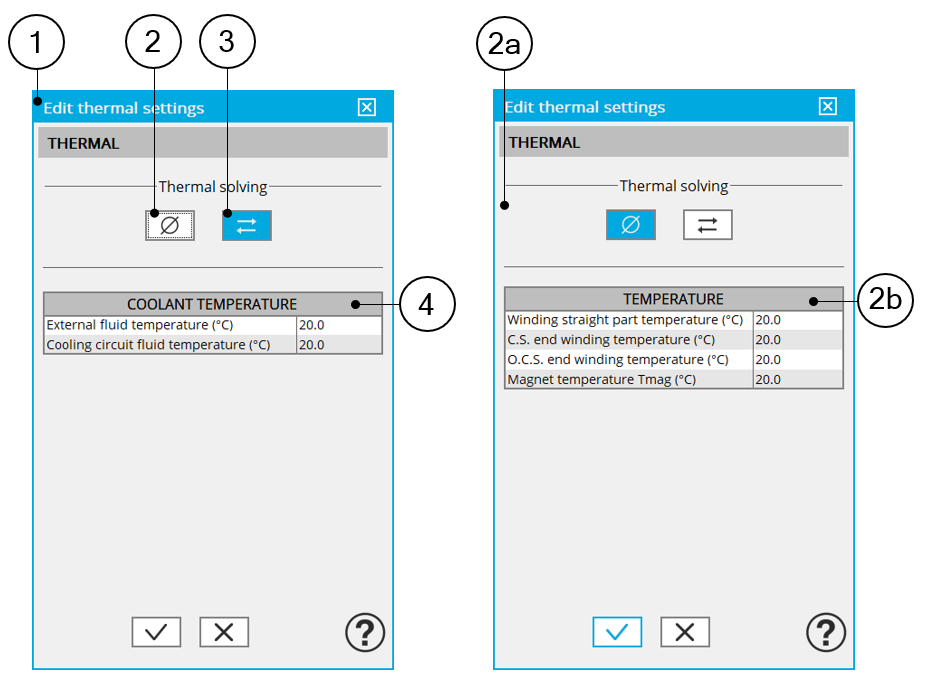 | 2a | Dialog box allowing to define the machine active components winding and magnets temperatures to run test without any thermal analysis. |