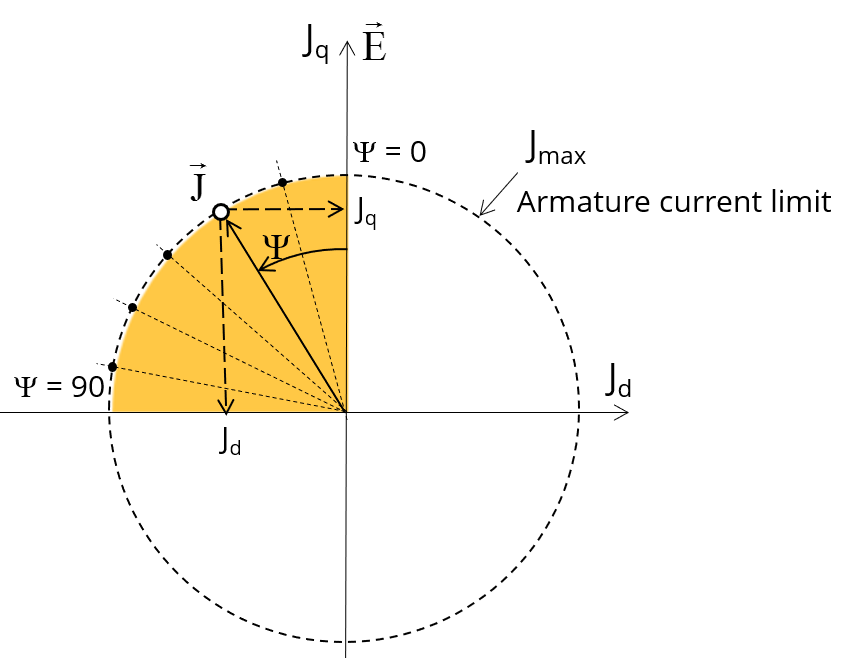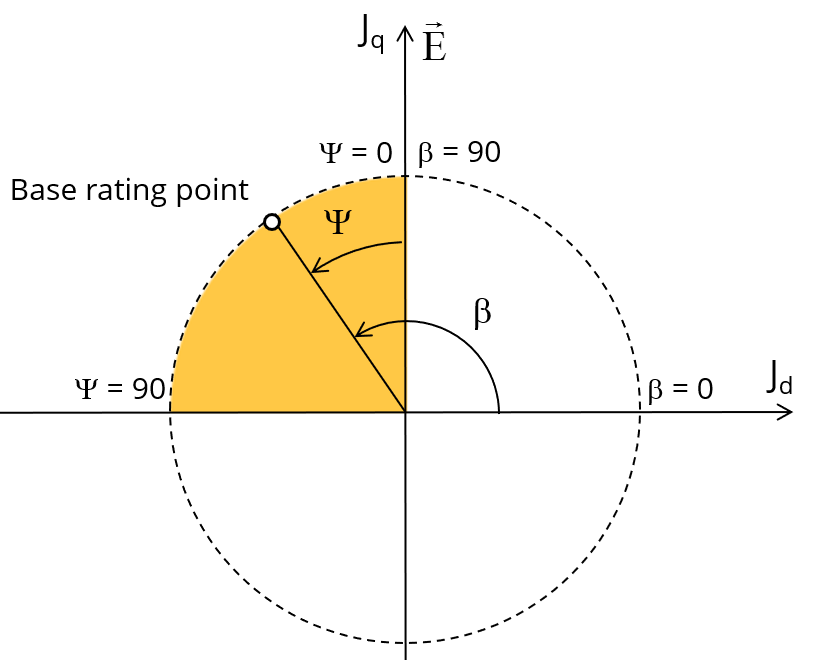 The variation area for Ψ is represented by the quarter circle (colored yellow in the diagram). This discretization is necessary to find the working point corresponding to the base speed point of the torque-speed curve.