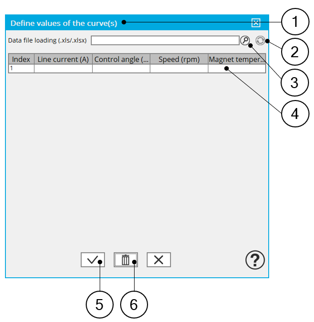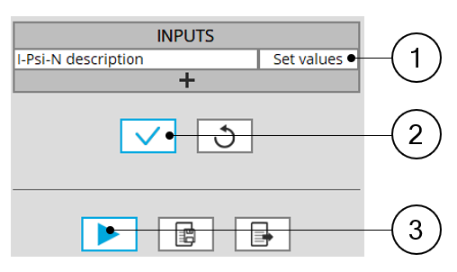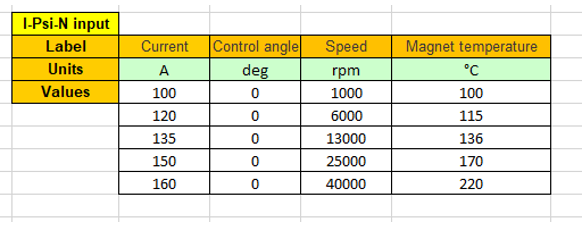 | 1 | Click on the button “Set values” of the field “ I, Ψ, N description” to define the working points in a dialog box. Refer to the next illustration which shows how to fill the working point table. |