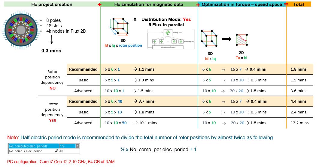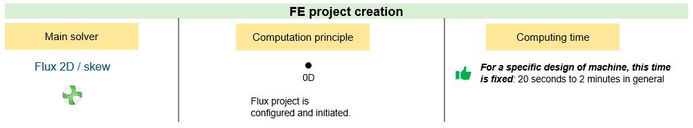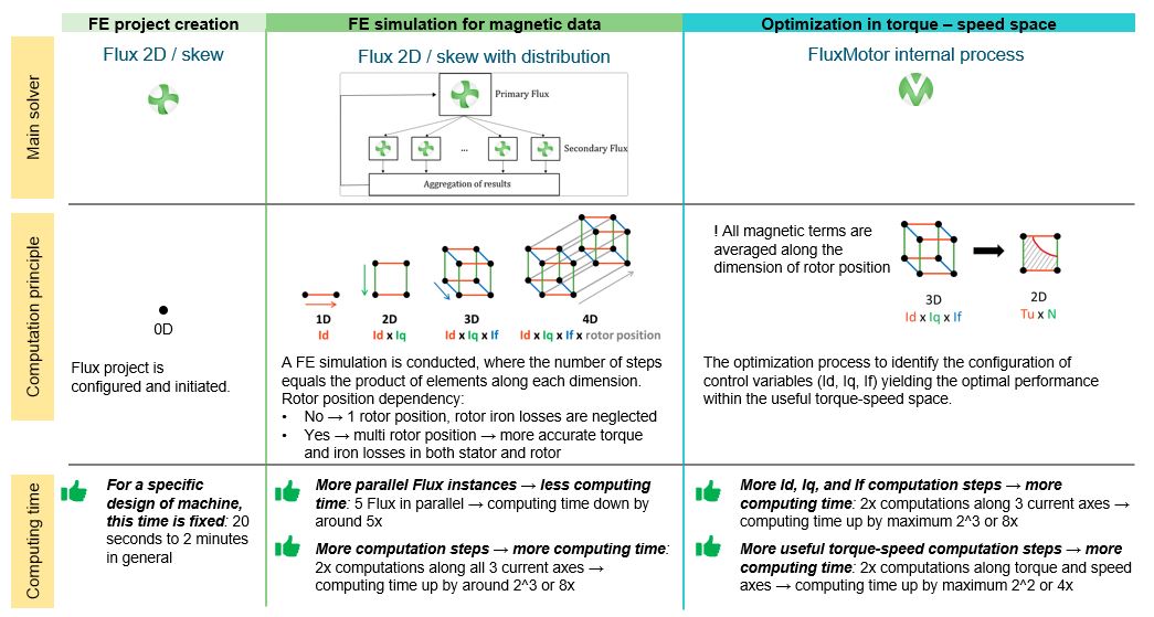 The only factor impacting the computing time of this step is the design of the machine itself. Factors such as whether it is skewed, the number of poles/slots being simulated, the number of nodes utilized to depict the machine in Flux 2D/Skew, and whether conductors in slots are accounted for in Flux 2D/Skew, all play a role.Note: As a general guideline, in the efficiency map, since conductors are not explicitly represented in Flux 2D/Skew, this step typically consumes a relatively short amount of time within the overall computing process, typically ranging from 20 seconds to a minute.