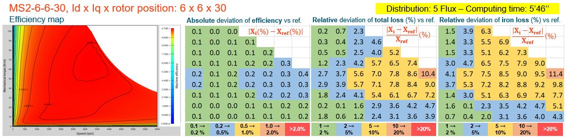 Example of SMWF efficiency tests – Reference model with 6 steps for current and 1 rotor position (without rotor position dependency) Observations:- Computation times range from 3 minutes to approximately 30 minutes, progressively decreasing from the first to the sixth configuration as the number of computations decreases.