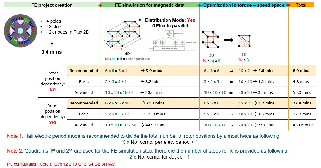 - The advanced setting delivers very accurate results but requires significant computing time, taking up to 4 minutes without rotor position dependency and 15 minutes with it. Memory issues may arise as finer characteristic space requires more memory resources. Refer to FluxMotor Supervisor help for guide on how to setup memory configuration of FluxMotor.