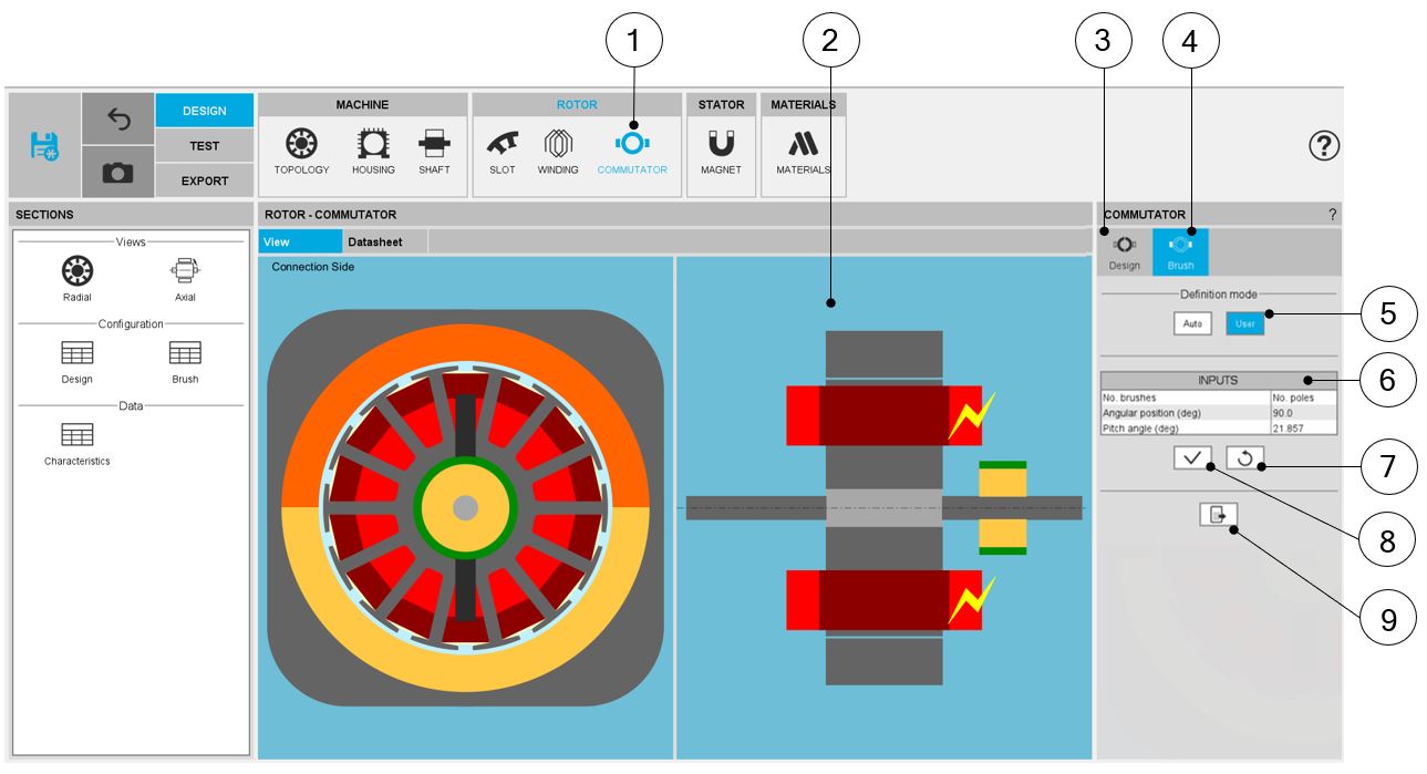 Selection of the ROTOR subset: COMMUTATOR panel (Click on the