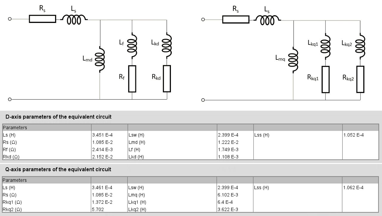 - Wound field synchronous machine equivalent scheme, D-axis and Q-axis (Zero, 1st or 2nd) with its associated computed parameters