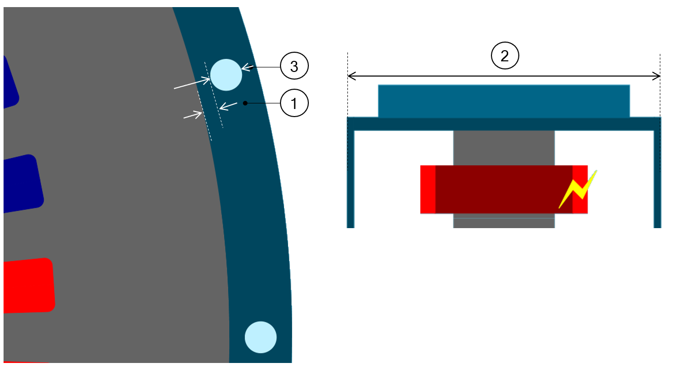 | 1 | Radial view of the motor, including the housing topology with cooling circuit topology and dimensions. |