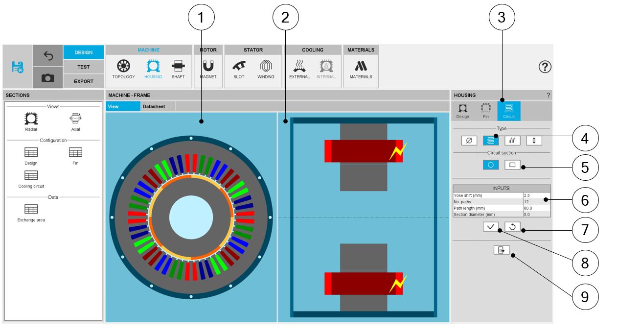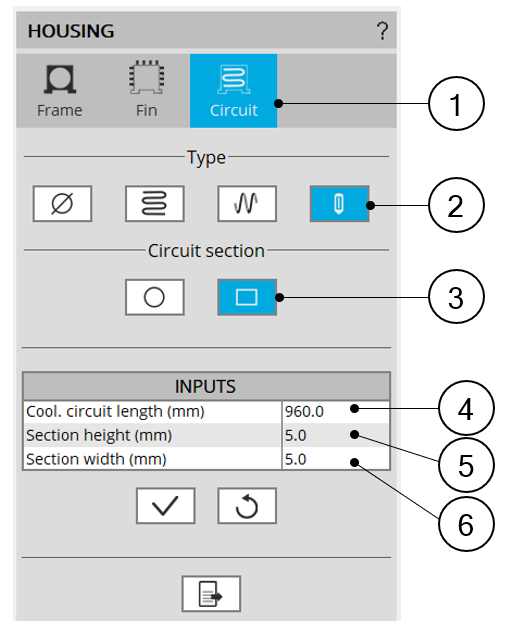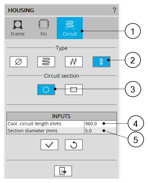| 1 | The section Circuit (Cooling circuit) is selected to define the type and dimensions of the cooling circuit. |