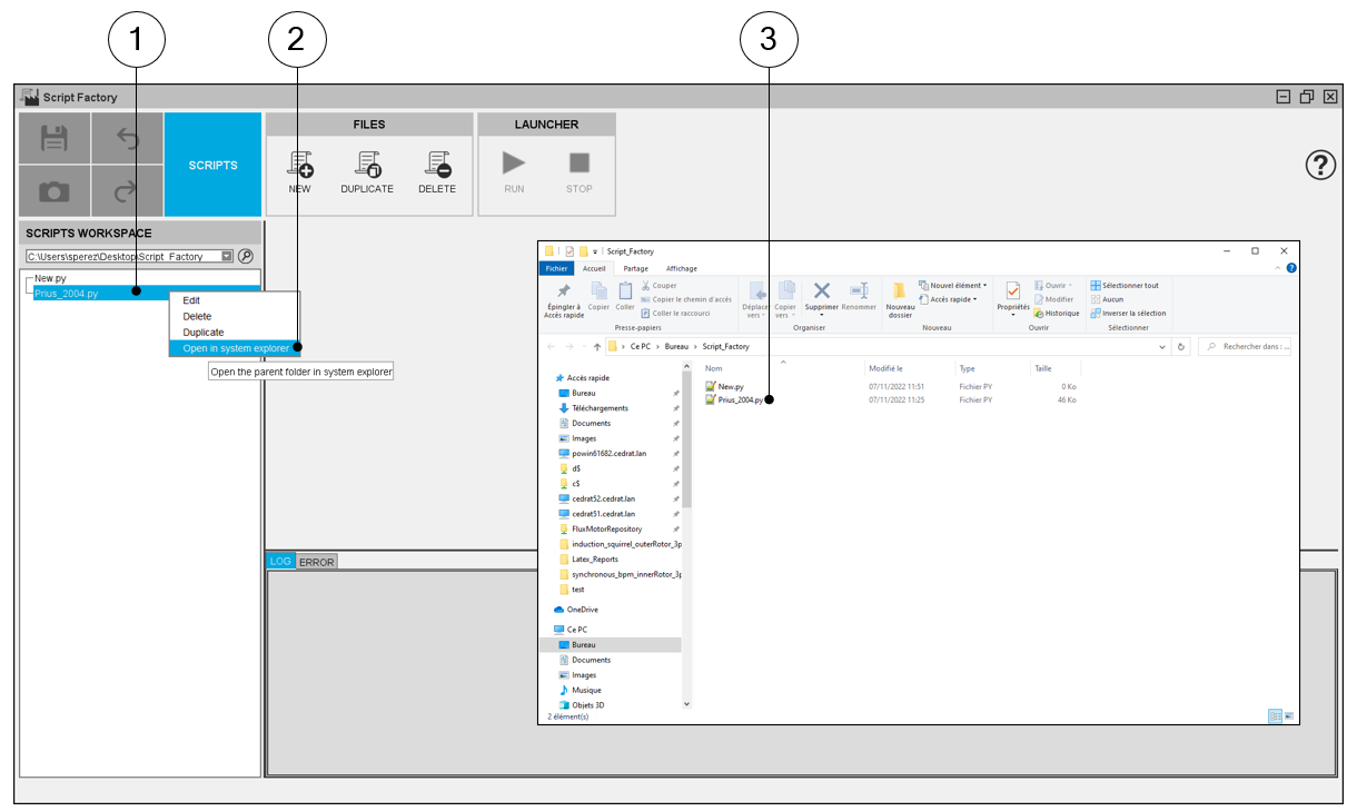 In Script Factory application, a selected python file from the workspace tree can open in system explorer.