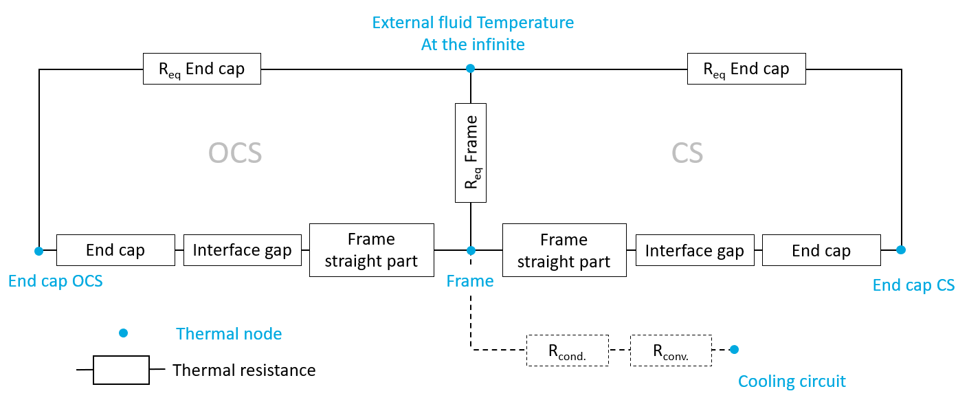 The dimensions of the frame, the Connection Side end cap and the Opposite The equivalent thermal resistances defined above are integrated in the global thermal network. The part of this network corresponding to the end parts of the machine is described below.