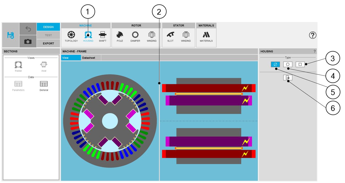 | 1 | Selection of the MACHINE subset: HOUSING panel (Click on the icon HOUSING) |