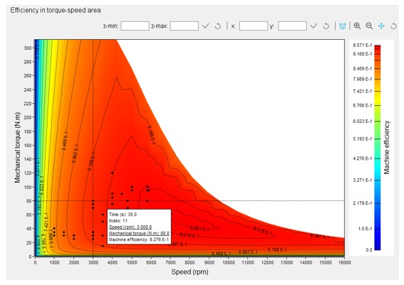 The second feature allows the user to define a duty cycle by giving a list of working points (speed, torque) versus time. The displayed results illustrate the machine performance over the considered duty cycle (mean, min, and max values).