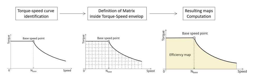 Upstream the base speed point, the torque speed curve is obtained by imposing the useful torque computed at the base speed point and by maximizing the efficiency.