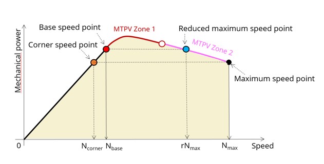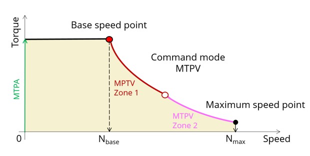 Torque speed curve with MTPV command mode Over the speed range [Nbase, Nmax.] we distinguish two main zones, the Zone 1 commonly called “Flux weakening” and the Zone 2 commonly called “MTPV curve”.