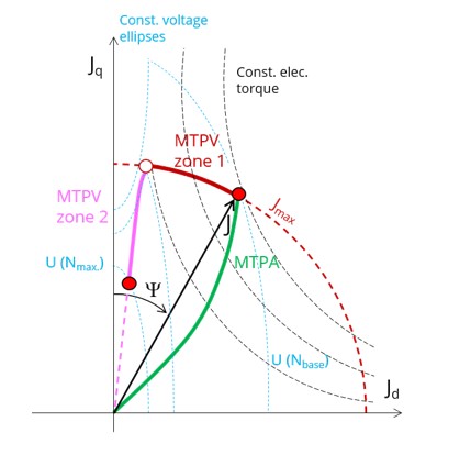 Evaluation of the working point in Jd-Jq plane by considering iso-torque, iso-current and iso-voltage In the first zone (MTPV zone 1), the maximization of the mechanical torque for a given speed is reached by keeping the maximum values of voltage and current, and by driving the control angle (Ψ). In a second zone (MTPV zone 2), the maximization of the mechanical torque is reached by keeping the maximum values of voltage and by decreasing the line current below the maximum allowed value and by driving the control angle (Ψ). In FluxMotor, the MTPV label is used to mention the combination of these two zones (for both, the maximum torque is computed, at the maximum voltage available). The optimization process automatically deduces the best working zone according to the following constraints: