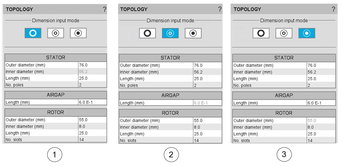 In the topology sub area, three ways are possible to define the structural data of the machine based upon the diameters and the airgap. They are illustrated below.