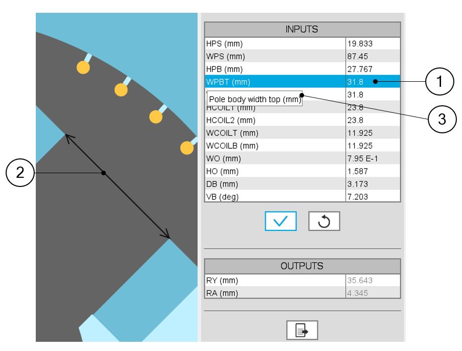 | 2 | The selection of a parameter label displays the corresponding arrow on the picture. |
