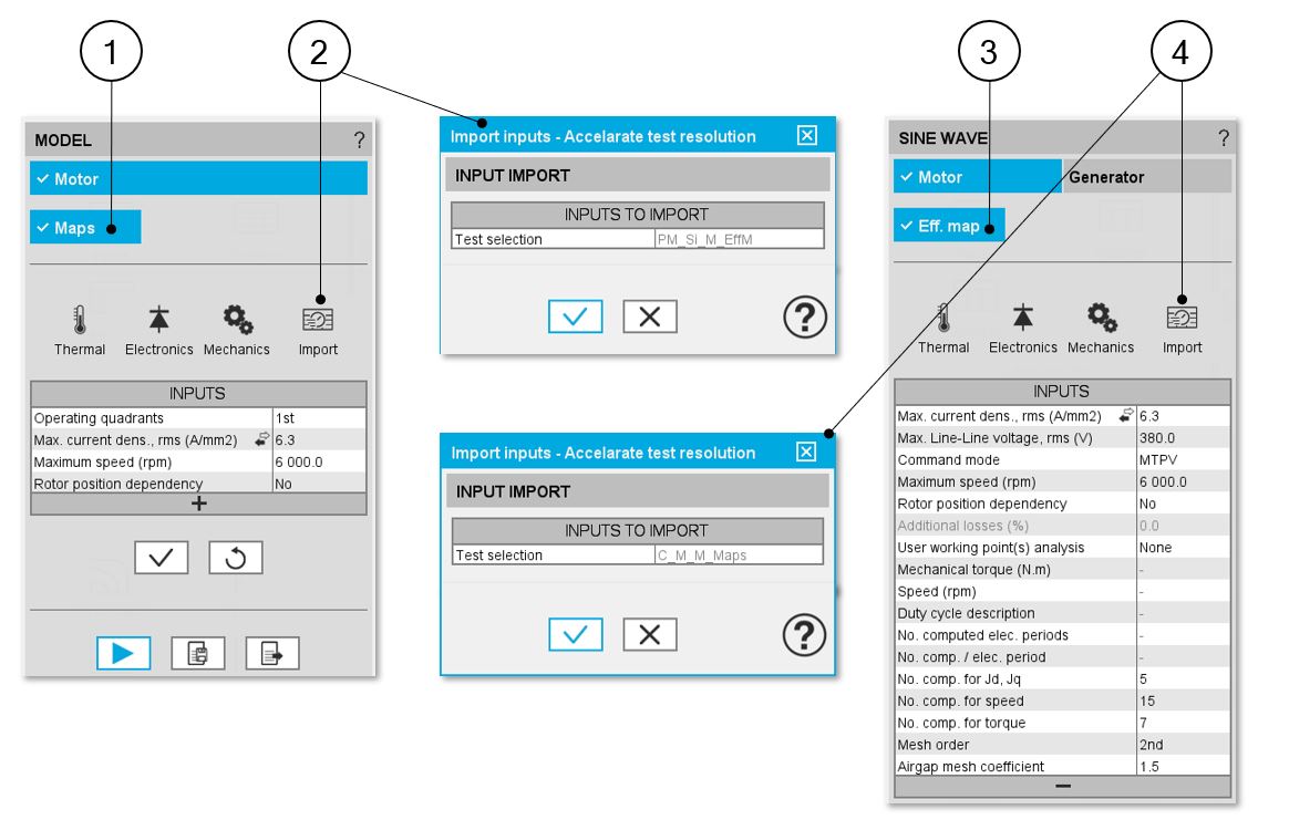 An import button is available for allowing sharing the data simulated in Flux between “Characterization / Model / Map” and “Performance mapping / Efficiency map” tests.