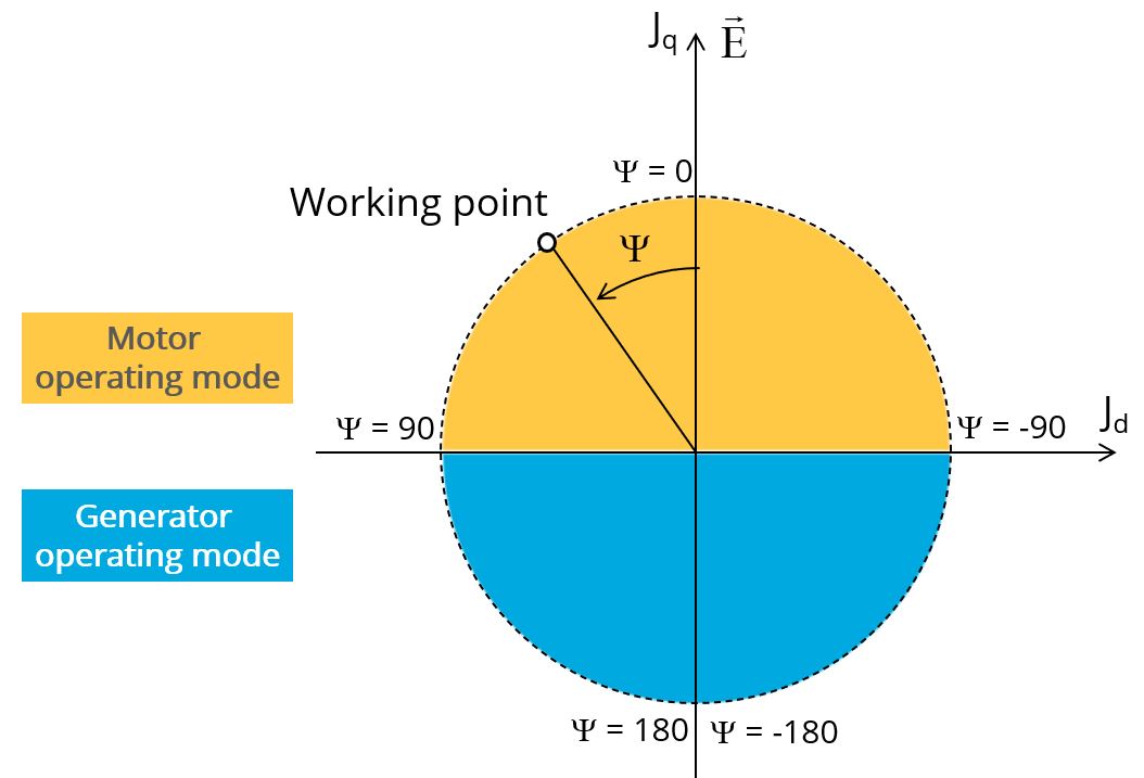 Considering the vector diagram shown below, the “Control angle” is the angle between the electromotive force (E) and the electrical current (J) (Ψ = angle (E, J)).