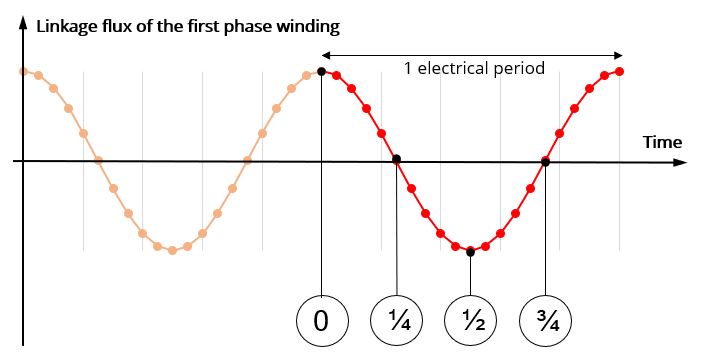 - Instant 1/4: the linkage flux of the first phase winding is supposed to be zero
