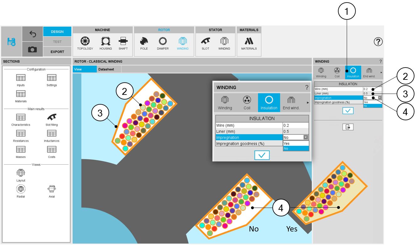 | 1 | Insulation settings allow the user to describe the coil insulation (wire, liner, impregnation) and how to fill the slot. |