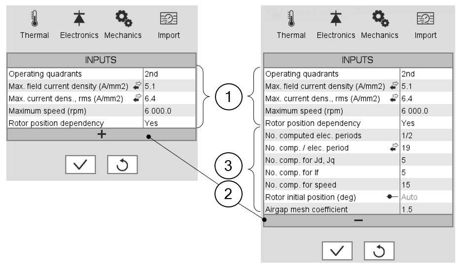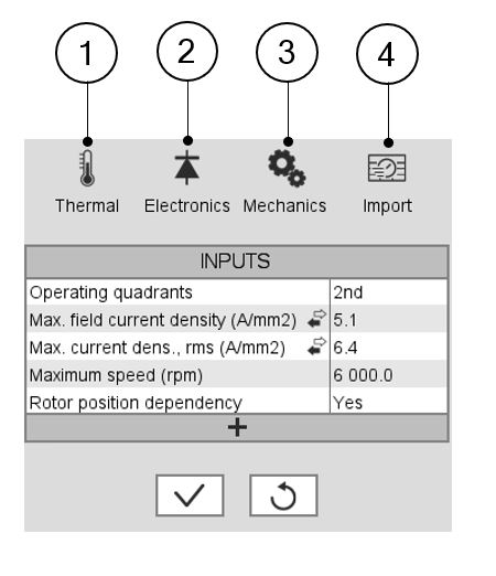 | 1 | Button to define the thermal inputs (Solving mode or winding temperatures) |