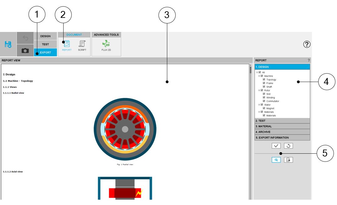 Five steps are needed to build and export a report: In EXPORT / DOCUMENT / REPORT