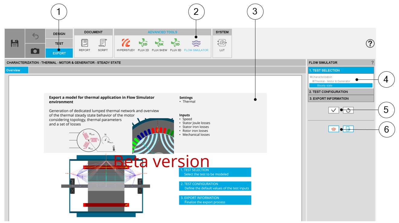 | 3 | Zone to visualize the overview of the selected model to be exported. Zone to visualize the overview of the selected model to be exported. Currently, there are two models: thermal analysis in steady state and one in transient. The one in transient is in beta mode. |