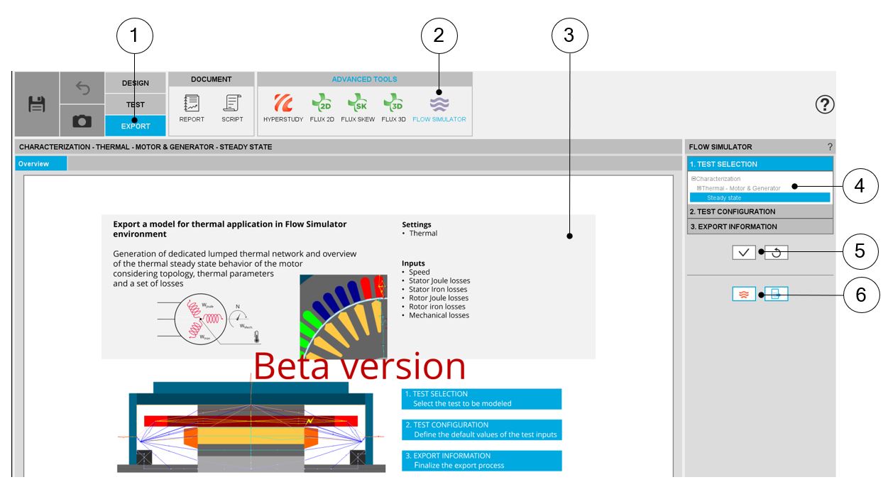 | 3 | Zone to visualize the overview of the selected model to be exported. Zone to visualize the overview of the selected model to be exported. Currently, there are two models: thermal analysis in steady state and one in transient. The one in transient is in beta mode. |