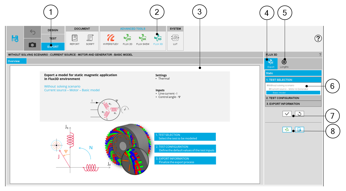 | 8 | Buttons to export the python file for building the model in Flux® 3D environment or to launch directly Flux® 3D. |