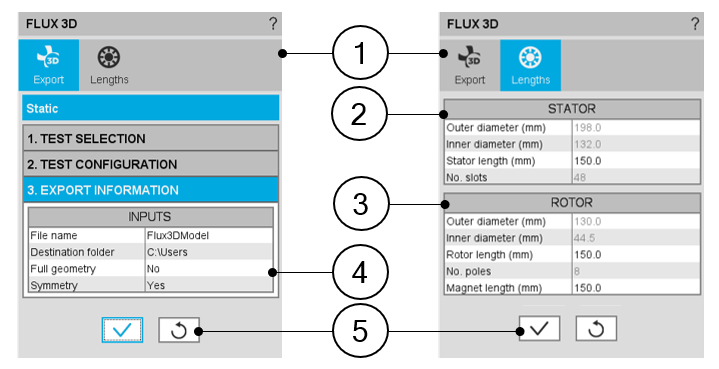 | 1 | Tab selector to define general export parameters and axial lengths in Flux® 3D environment |