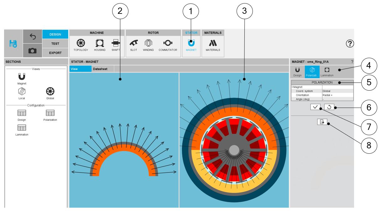 | 1 | Selection of the STATOR subset: POLARIZATION panel (Click on the icon POLARIZATION) |