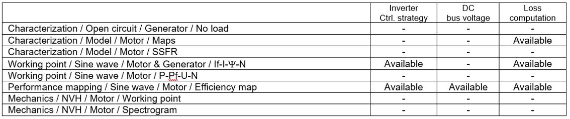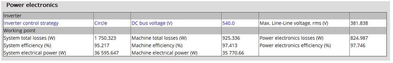 The losses and the efficiency are computed for the machine, the power electronics stage and the system. The “system” gathers the machine and the power electronics stage.